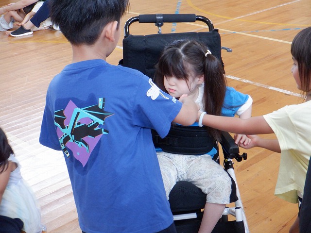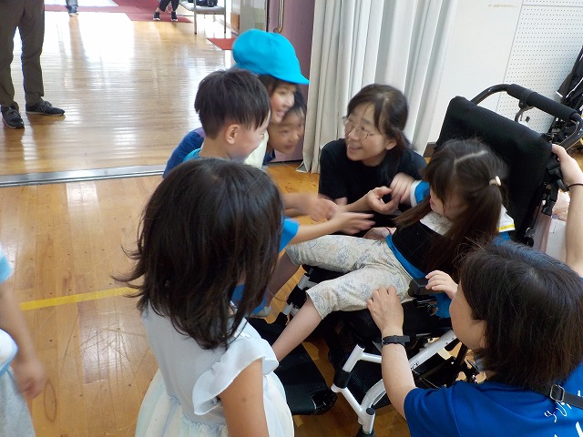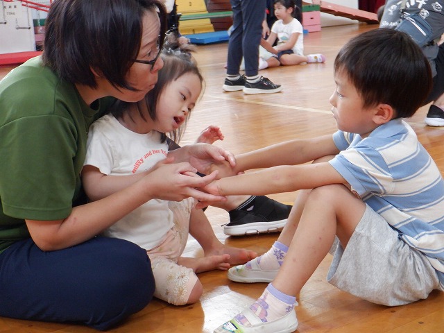 9月18日、篠山幼稚園と早期発達支援室2名(今回は1名欠席)、幼稚部の1名との交流会を本校体育館で行いました。昨年度から定期的に、場所を交互に入れ替えて行っております。すでに1学期も行っているので、「ひさしぶり~」といった声が聞こえるなどすっかりと顔なじみなってあたたかい雰囲気で交流が始まりました。交流会では、体育館で体を使ってあそんだり、遊具を使ってサーキットをしたりして一緒に楽しみました。早期発達支援室や幼稚部の子どもたちは普段見られないような表情が見られるなど笑顔いっぱいの交流会となりました。