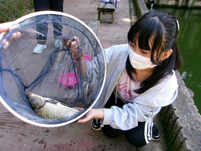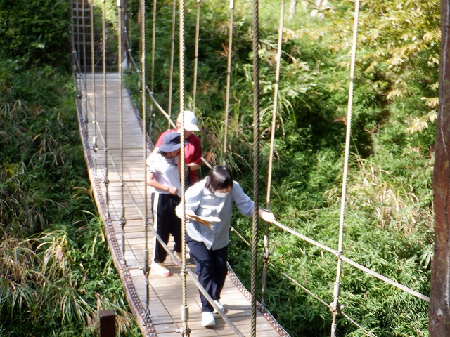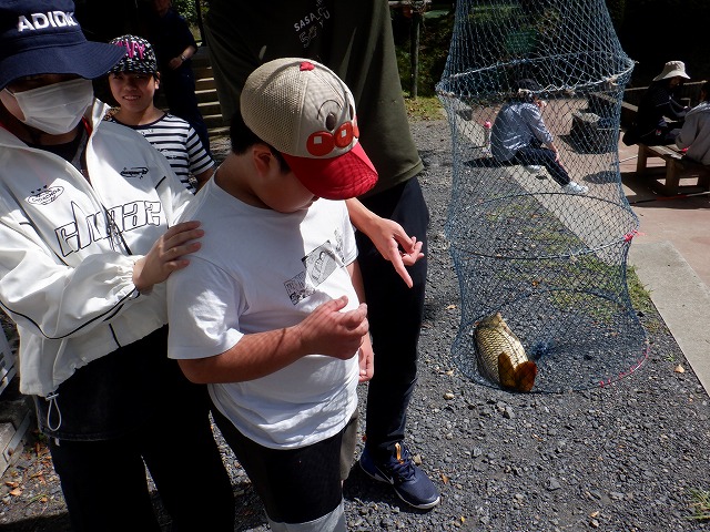小学部の子どもたちにとっては、学校行事で初めての宿泊学習となり、わくわくドキドキの2日間でしたが、中学部の先輩や同級生の友だちや先生の協力で楽しく充実した2日間となりました。「なかよくする」「カレーづくりをがんばる」など一人一人がめあてをもって取り組みました。1日目は、秋晴れの好天の中、釣り体験やパターゴルフ、アスレチック、オリエンテーリングなどしっかりと体と動かして自然を満喫しました。釣り体験では、なかなか釣れない時間がありましたが、何とか1匹大きな鯉を釣り上げ「やったー」と歓声が沸きました。そのあと、粘ってもう1匹釣り上げました。アスレチックやオリエンテーリングでは、目的地をめざしてしっかりと歩いて散策しました。アスレチックでは、頂上まで登り「ヤッホー」を大きな声を出して、こだまする声にびっくりしていました。ホテルでは、大きなお風呂に入ったり、友だちや先生と一緒に寝たりするのもしっかりと体を動かしていたので、気持ちよく過ごし、入眠できたようです。