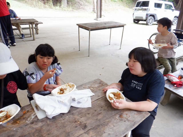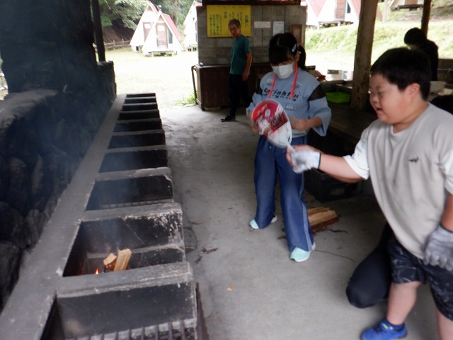 2日目は、朝の体操や散歩を行い、焼き杉板づくりにチャレンジしました。真っ黒な杉板をブラシでゴシゴシ磨きあげて、それぞれ好きな文字や絵を書くなどして、思い出の記念の作品となりました。そして、いよいよ多くの子どもたちがめあてにしていたカレー作りです。「お米を研ぎ、飯ごうを用意する」、「野菜を切る」、「火をおこす」など、それぞれの役割に分かれておいしいカレーができました。普段カレーが苦手な子でもカレーをおかわりするぐらいおいしかったようです🍛