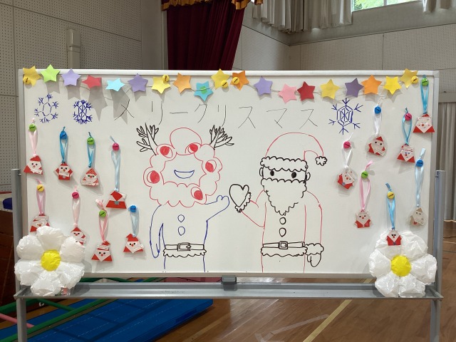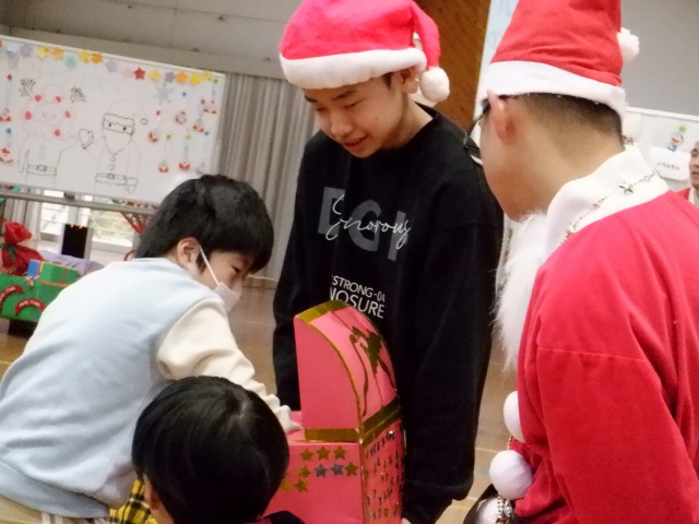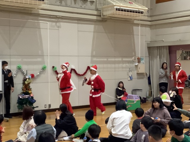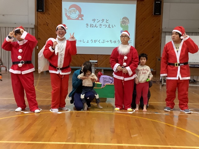 12月12日(金)、全校生で「サンタがささようにやってきた」を行いました。高等部の生徒たちが中心となり、企画、運営したクリスマス会です。この日の為に、歌の練習、ゲームの内容を考え、会場の準備そして片付けまで、それぞれ役割をもって取り組みました。会の始まりは、サンタに変装した生徒が入場、合奏「サンタがまちにやってくる」の演奏や宝さがしビンゴゲームなど、縦割り班に分かれて楽しみました。最後は、サンタからのプレゼントももらって笑顔いっぱいの楽しいクリスマス会となりました。高等部の生徒も下級生の喜んでいる姿を見て満足そうでした。楽しい会をありがとう。