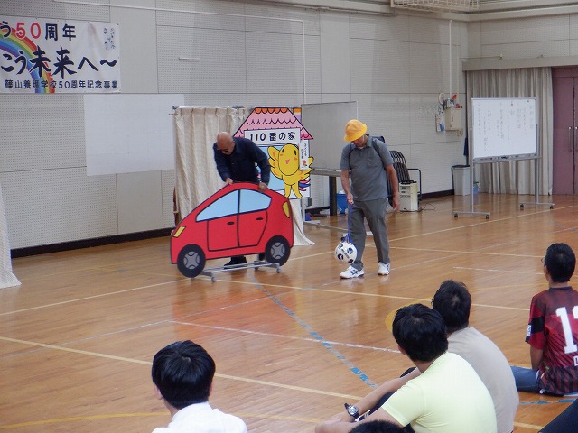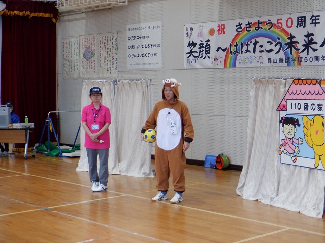 10月7日(火)、防犯教室を全校生で行いました。今年度は、篠山防犯協会、篠山警察のみなさまにお世話になり、「いのへい劇団」の寸劇による不審者から自分の身を守る防犯についての学習を行いました。