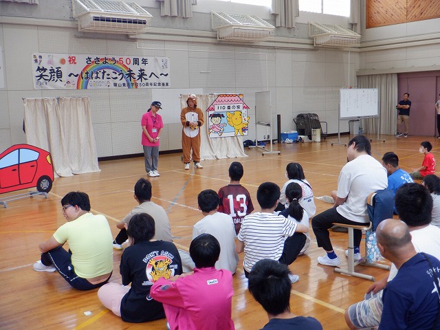 劇では、うりぼうのいのへい君が、あやしい人に連れていかれないようにするには、どうすればいいのかをわかりやすく、楽しく演じてくださいました。「いかのおすし」や、「子どもも守る家」に逃げ込むこと、出かけることきは、「行き先」や「帰宅時間」などを伝えてからできかけることなど教えていただきました。