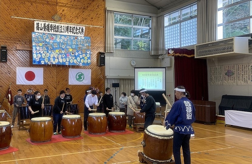 第2部アトラクションの部では、PTA親子活動を行いました。篠山鳳鳴高校インターアクト部デカンショバンドによるデカンショ踊りを親子で踊り、鼓篠組のみなさんに引き続きお世話になり、太鼓体験を親子で行いました。また、高等部による喫茶や販売活動も行い、高等部の生徒も飲み物を提供したり、販売活動を行ったりしてお客様におもてなしをしました。