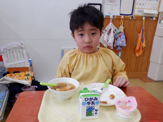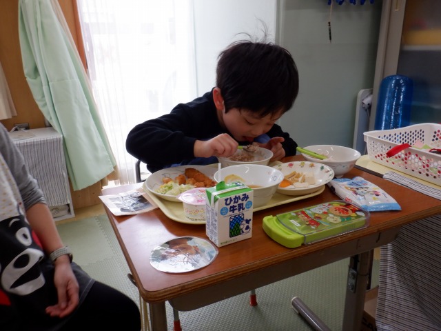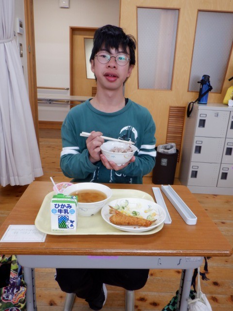 3月6日、今日の給食献立は、「卒業・卒園お祝い献立」でした。赤飯、エビフライ、キャベツとコーンのサラダ、玉ねぎのみそ汁、デザートには、イチゴゼリーをつけていただきました。今日の献立に関わらず、食のこだわりがある子もそうでない子もおいしくいただいています。特に今日は大きな「エビフライ」が2匹ð¤ð¤もあり、ぱくぱく、もぐもぐしていただいていました。給食センターのみなさん、いつもおいしい給食をありがとうございます。