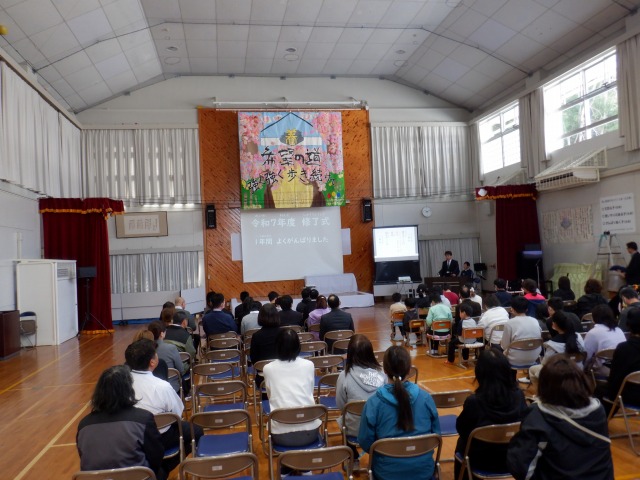 3月24日、令和7年度の修了式を迎えました。修了式では、学校長より、スライドで今年一年のがんばりを振り返りました。運動会や学習発表会、校外学習だけでなく、日々の学習やトレーニングの積み重ねのがんばりを称えました。そして、篠山養護学校の校名として最後となる校歌斉唱を元気よく歌いました。