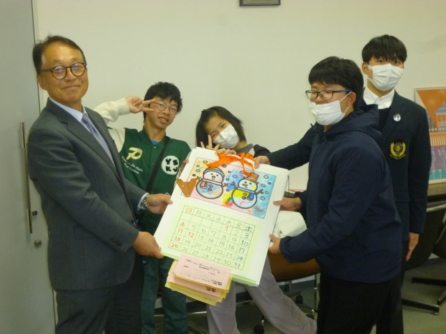 すべての学部で手分けして、来年度の手づくりカレンダーを作りました。児童生徒会で、丹後教育長様に渡しました。