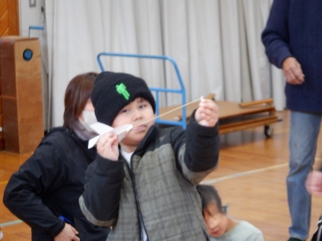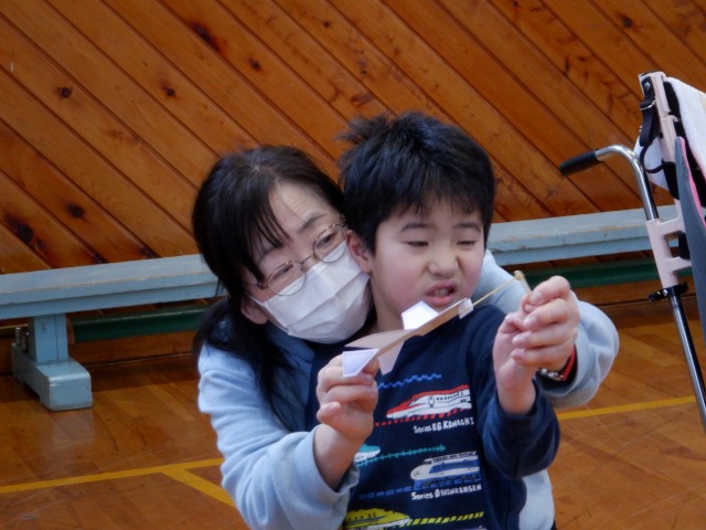 2月18日、幼小学部、早期発達支援室の生活単元学習で紙ひこうき体験を行いました。紙ひこうき名人に教えていだだき、体験しました。ゴムを使って、勢いよく飛び出した紙ひこうきが体育館の天井や端の方まで飛んでいくの見て「わーっ」と歓声が沸きました。何度も何度も笑顔で夢中に飛ばしていました。