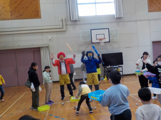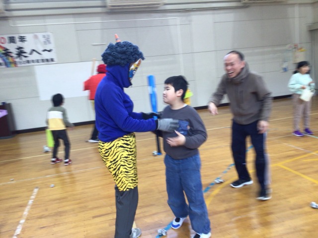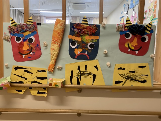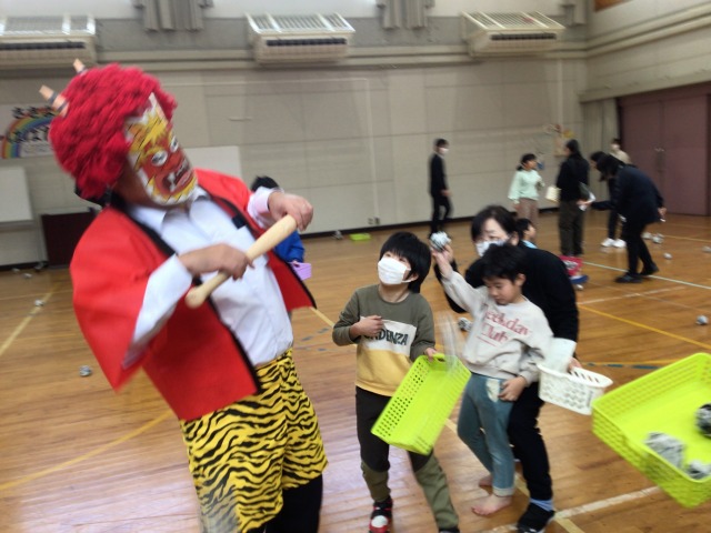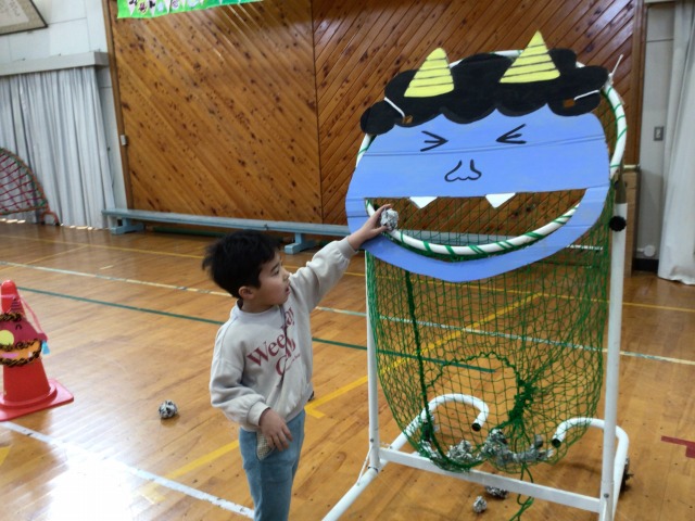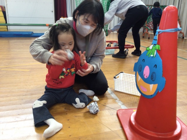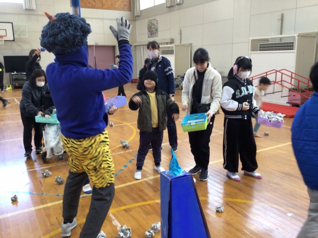 2月3日、幼小学部の生活単元学習で節分遊びをしました。早期発達支援室の幼児たちも一緒に活動をしました。新聞紙でまめづくりをして、的にめがけて遊びました。そうすると、赤おに、青おに、かわいいおにが登場!!ð¹元気よく「おにはそと」と言って、新聞紙豆を投げつけてました。鬼は泣かせるつもりでしたが、泣くは子はおらず退散しました(笑)早期発達支援室には、かわいいおにの製作物が掲示されています。今年一年、健康に過ごせるといいですね。